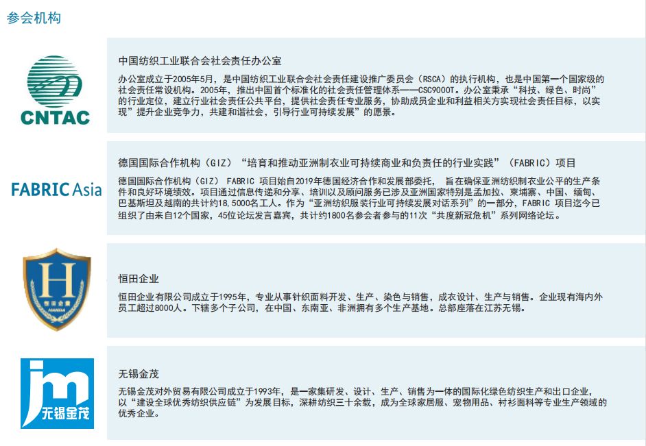 為了深入了解和探討這些問題,在德國國際合作機(jī)構(gòu)(GIZ)的協(xié)助下,中國紡織工業(yè)聯(lián)合會(CNTAC)社會責(zé)任辦公室開展了涉及在緬甸、柬埔寨、越南和孟加拉的85家中資企業(yè)的調(diào)查研究,并將在本次會議發(fā)布調(diào)研報告。