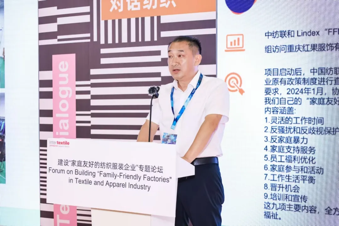 嘉賓分享環(huán)節(jié),聯(lián)合國兒童基金會駐華辦事處營養(yǎng)項目官畢重軍、香港莉迪斯(香港)有限公司上海代表處可持續(xù)發(fā)展區(qū)域經理周美琴、蘇州美山子制衣有限公司(愛慕子公司)人力行政總監(jiān)黃麗、全總行業(yè)工會紡織工作部部長趙武、中國紡聯(lián)FFF項目特邀培訓師孫瑩分別代表工會、品牌方及FFF項目代表、以及行業(yè)專家,圍繞當前緊迫的社會需求與企業(yè)現(xiàn)狀,深入探討了如何通過合作與創(chuàng)新,推動家庭友好政策在紡織行業(yè)的落地與實施。各位嘉賓的發(fā)言高屋建瓴,既有對現(xiàn)狀的深刻剖析,也有對未來的美好憧憬。他們提出的資源整合、數(shù)字化轉型、優(yōu)質資源對接等解決方案,為紡織行業(yè)的轉型升級提供了寶貴的思路與方向。這些方案不僅有助于實現(xiàn)工作與生活的平衡,更將促進企業(yè)與社會的和諧共生,推動紡織行業(yè)向更加綠色、可持續(xù)的方向發(fā)展。